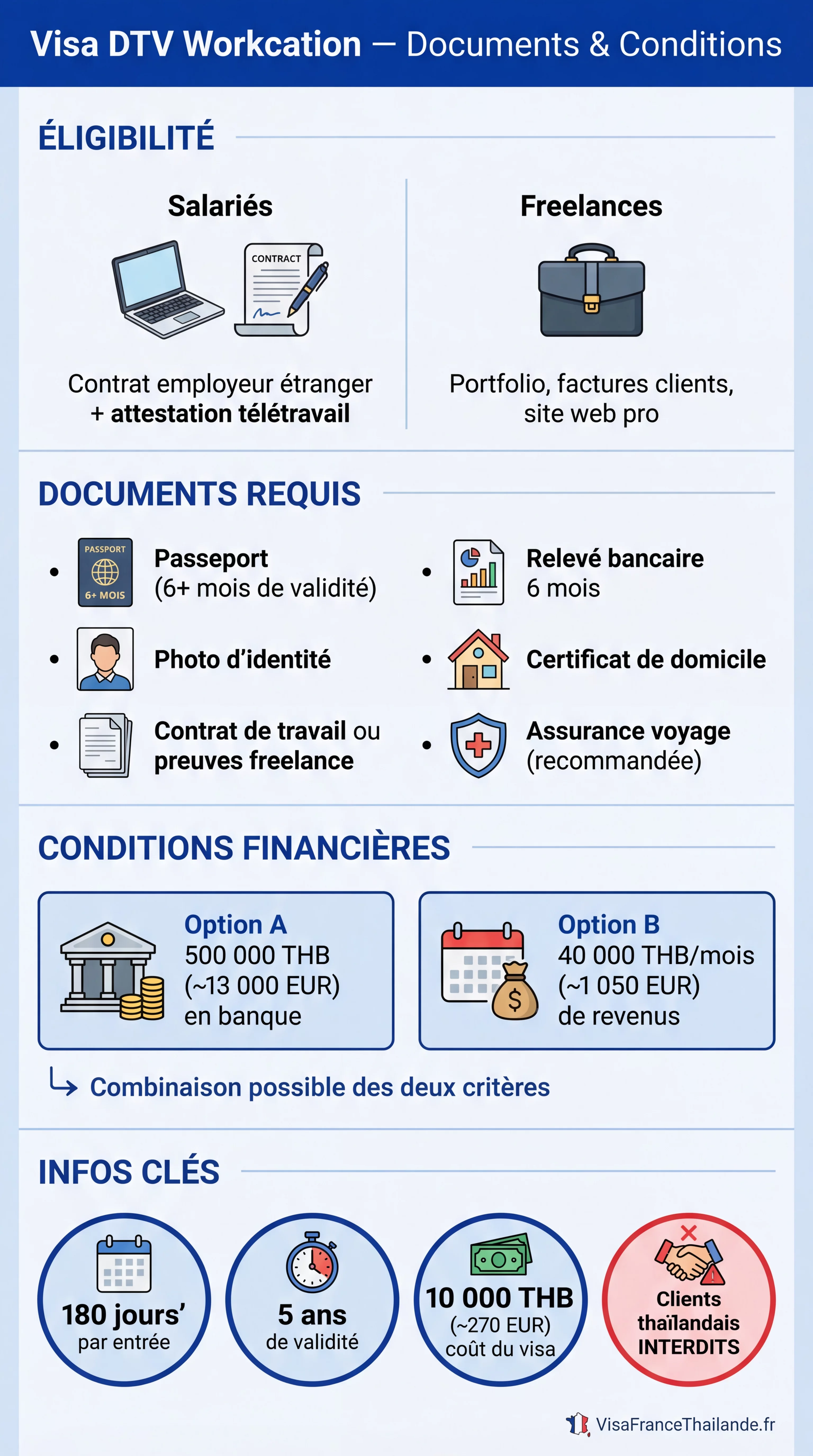 Infographie : documents et conditions du visa DTV Workcation pour travailler à distance depuis la Thaïlande.
