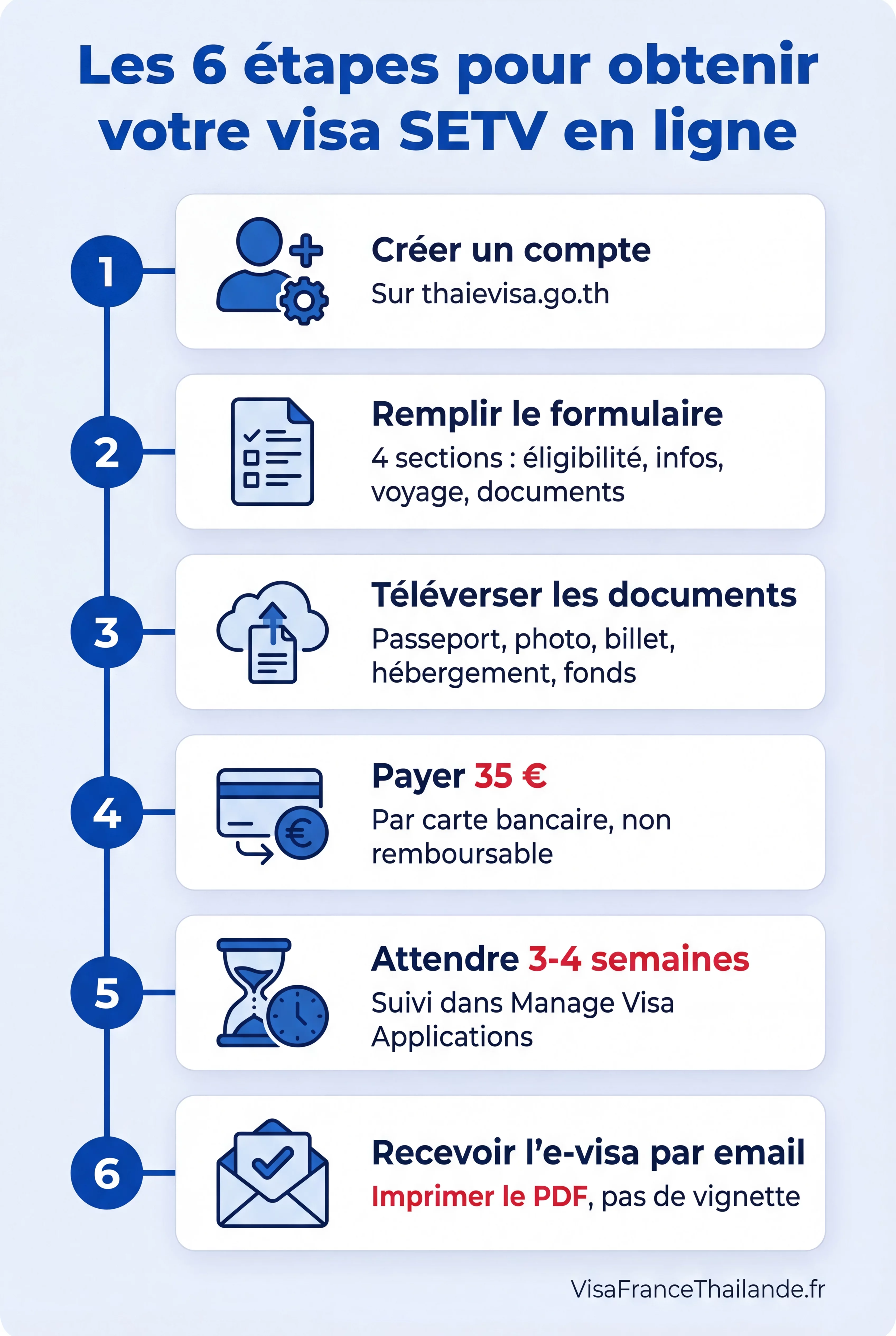 Infographie : les 6 étapes de la demande de visa touristique Thaïlande SETV en ligne.